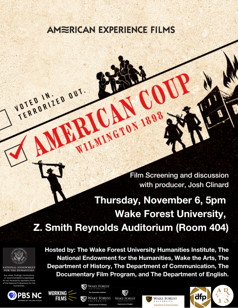 Wake Forest will host a screening of the documentary film, American Coup: Wilmington 1898, on Thursday, November 6th at 5:00pm in the Z. Smith Reynolds Library Auditorium (Room 404). Following the screening there will be a discussion and Q&A with coordinating producer, Josh Clinard, and Wake Forest University faculty.