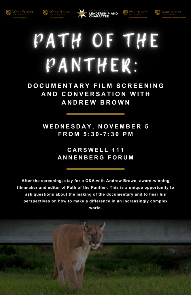 A special screening of Path of the Panther, the 2024 Emmy winner for Outstanding Nature Documentary, will be held on Wednesday, November 5th from 5:30-7:30pm in Annenberg Forum (Carswell 111). This powerful film explores the intersection of environmental conservation, human impact, and the future of the Florida panther.